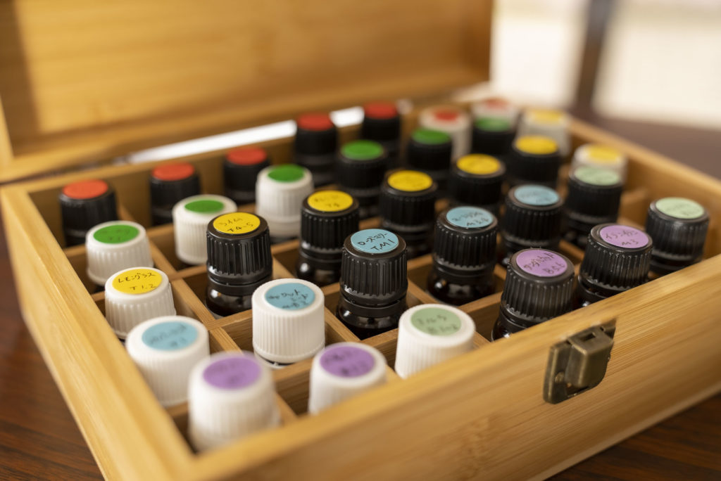 精油は約30種類の中からその日の体調、ご気分、お好みなどをうかがってオーダーメイドでブレンドさせていただきます。